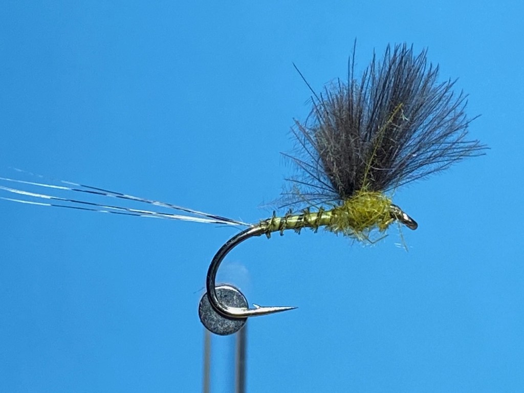 #8 Klinkhamer hook. Run light olive thread level with the hook point, the halfway back towards the eye. Use a polypropylene post, the colour of your choice, tied in at this point and trimmed at an angle to produce a pleasing taper to the body. Tie the hackle in at the base of the post, in such a way that the shiny side will face downwards when wound on; this allows the fly to sit lower in the water. A rib is optional, but wind the thread well into the bend of the hook and dub a slim tapered body up to just short of the post. Tie in peacock herl here and make the thorax. Tie off at the eye. Next turn the hook through ninety degrees with the eye downwards and run on some thin white thread around the post and the previously tied in hackle. By winding this thread around both the post and the hackle, create a firm base for the hackle to be wound around. It is important to make this is as even as possible as unevenness will make winding the hackle more difficult. Wind the hackle, each turn below the previous one and stop when no more turns will fit neatly. Whip finish.