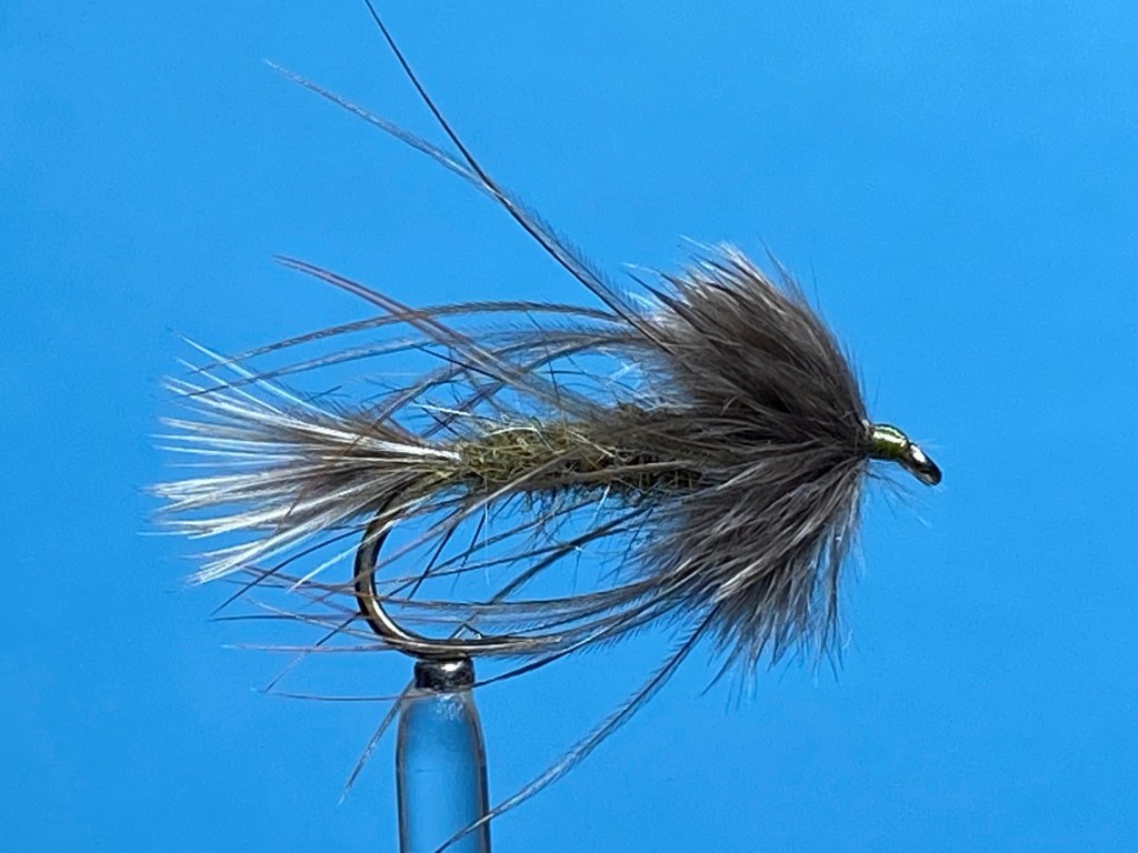 A detached olive uses a pre made tube body with tails. Trim it down to size and use an Antron post (Grey poly yarn). Olive grizzle saddle hackle – choose a small thin tip to use as a hackle. Add a tiny bit of musk rat dubbing. Snip off the post squarely and neatly.
