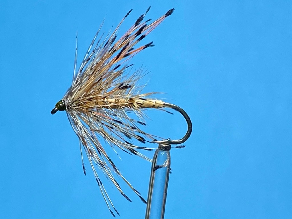 Red Superdubz adds lustre. Grouse feather as a hackle. No rib. A bit of varnish brightens it and protects it from the teeth of the fish.
