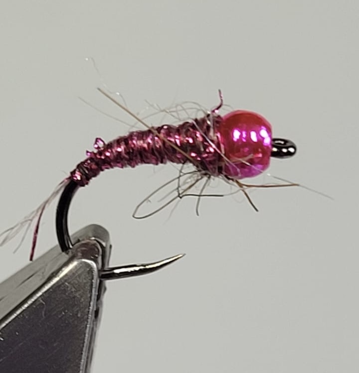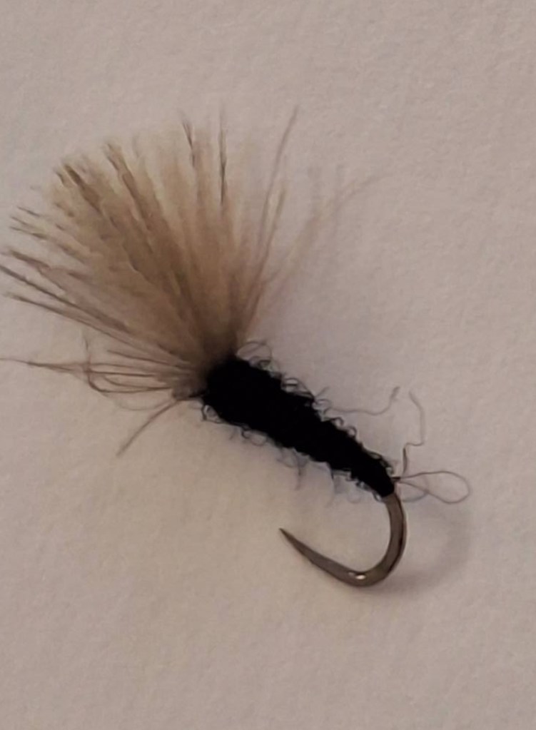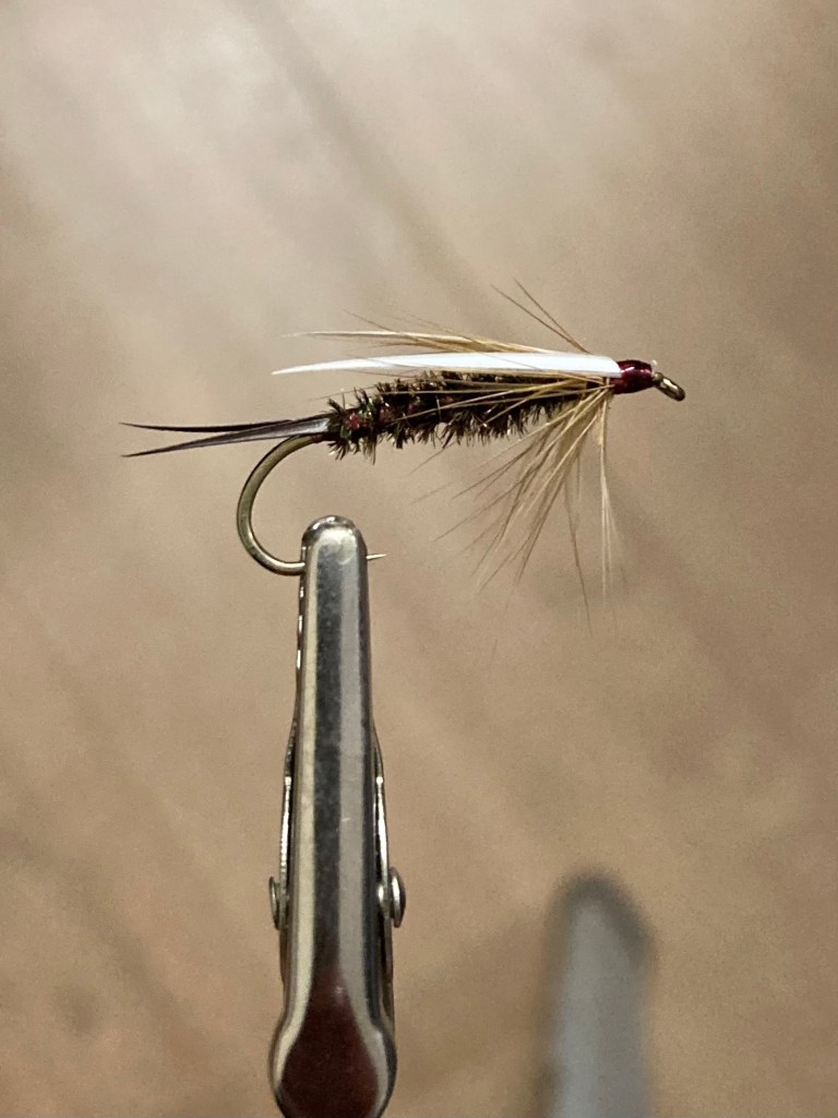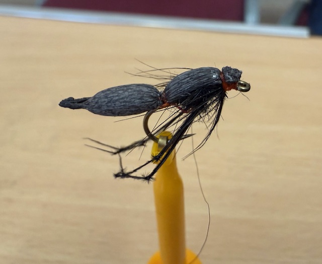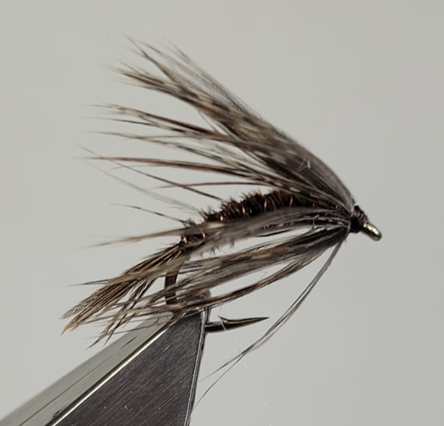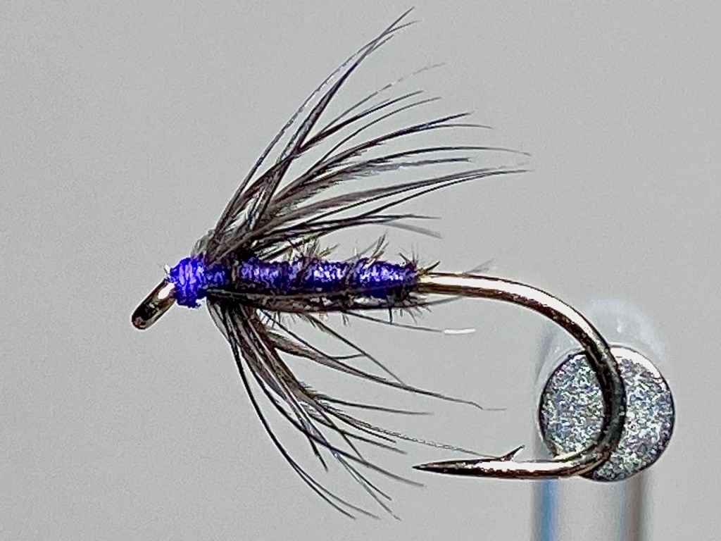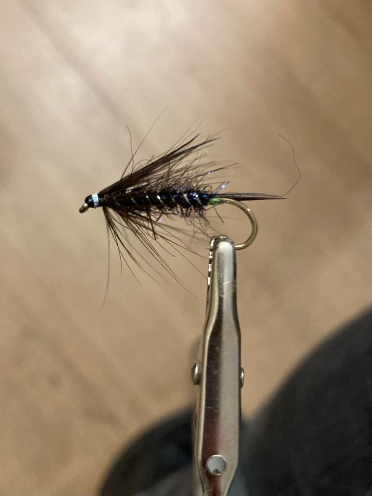 Tied on a DaiIchi hook. Burgundy thread with a holographic tinsel tag, fine wire rib. Suber dub black body and a grouse hackle.
