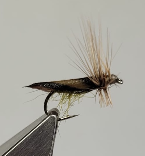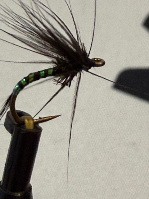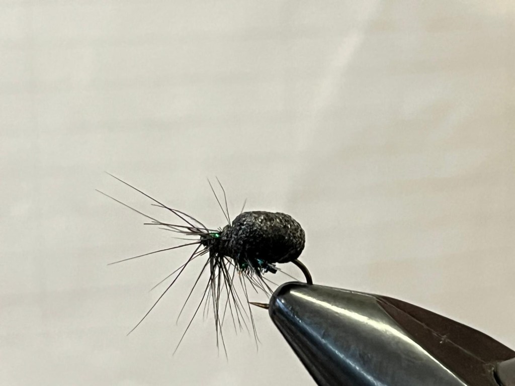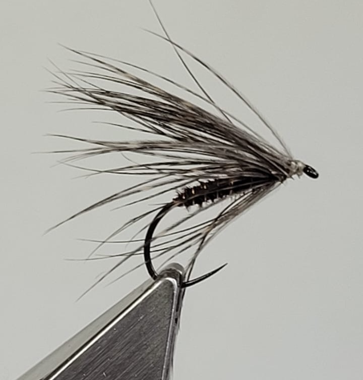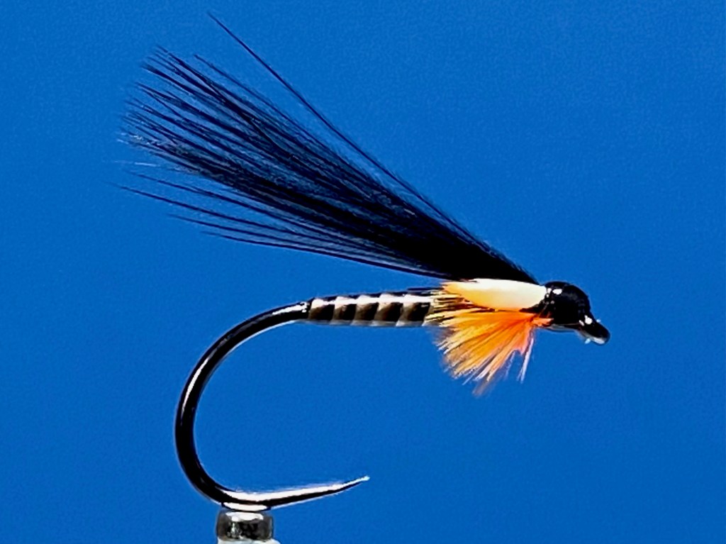 #14 hook, run black thread to the point, then half way back. Tie in a black hackle at this point(it will be wound forward later), tie in some black cock hackle fibres for a tail and tie in around the bend of the hook, also tying in pearl tinsel at the same time. Wind the rib up to the thorax and tie off. Tie in a peacock herl, wind around the thread to strengthen it and form a thorax. Then do the same with the cock hackle and wind over the thorax in the style of a Stewart’s Spider.