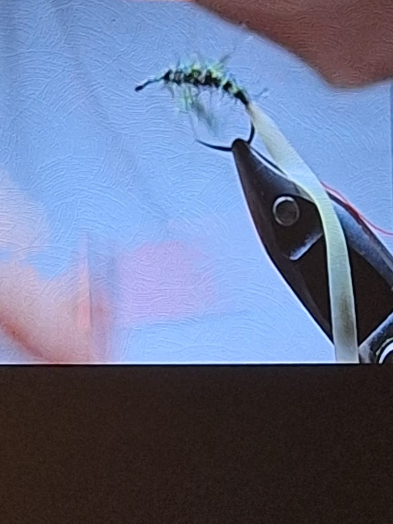 Bring the rib up in a zig zag fashion. Finish with a bit of dubbing that is buggy, leggy, flashy. Bit like a caddis pupa. Whip finish.