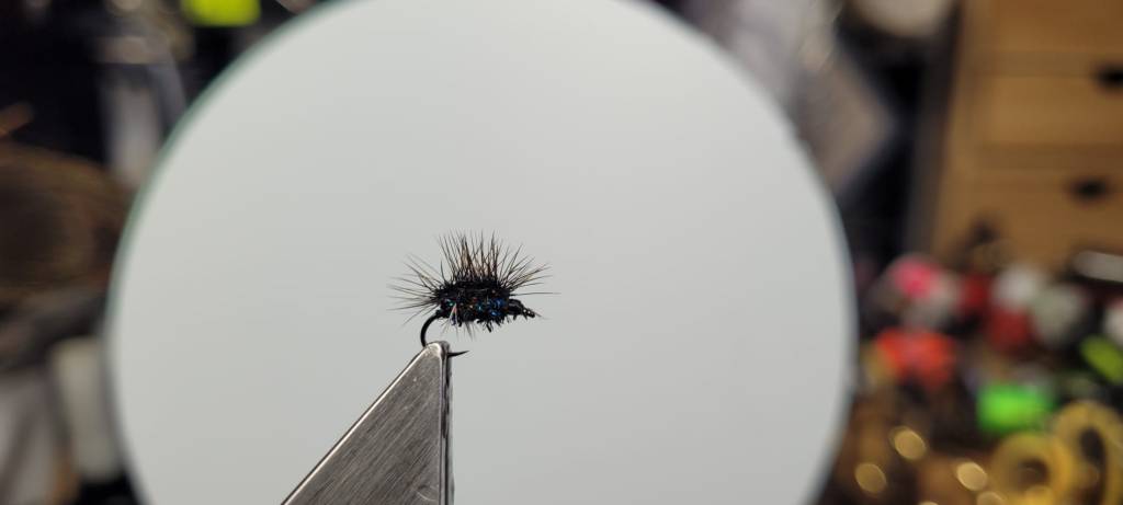 Thorax ice dubbing in black or any other colour as a hot spot. Whip finish.