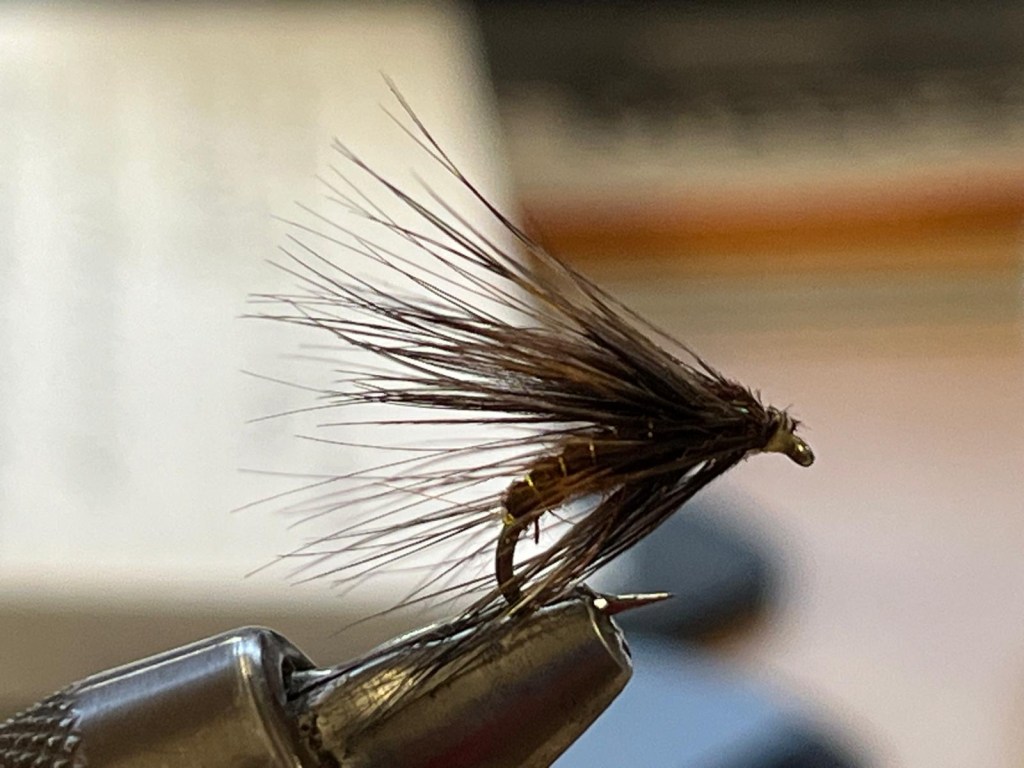 Tied on a longshank size 10, Karl used burgundy thread with Goose biots tied in to form the tail. Make a ‘ball’ at the end of the hook with the thread which should help the biots splay.