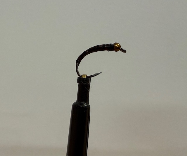 Dab of UV resin, turn the vice to evenly spread the resin down the length of the body. A zap of UV (15 sec). Alternatively leave on a bright windowsill to set.