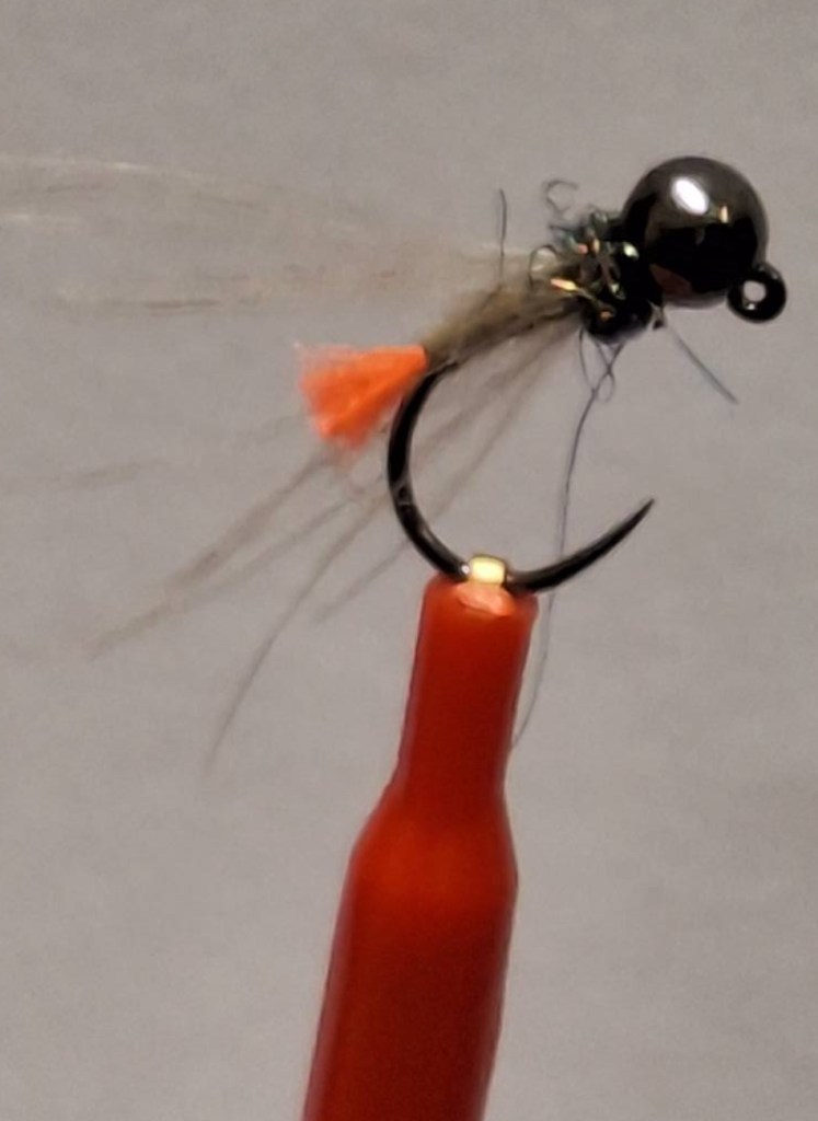 Tied on a Daiichi hook,the dressing uses Black thread and fluoro orange glow brite for the body with a prismatic holographic fine tinsel head.